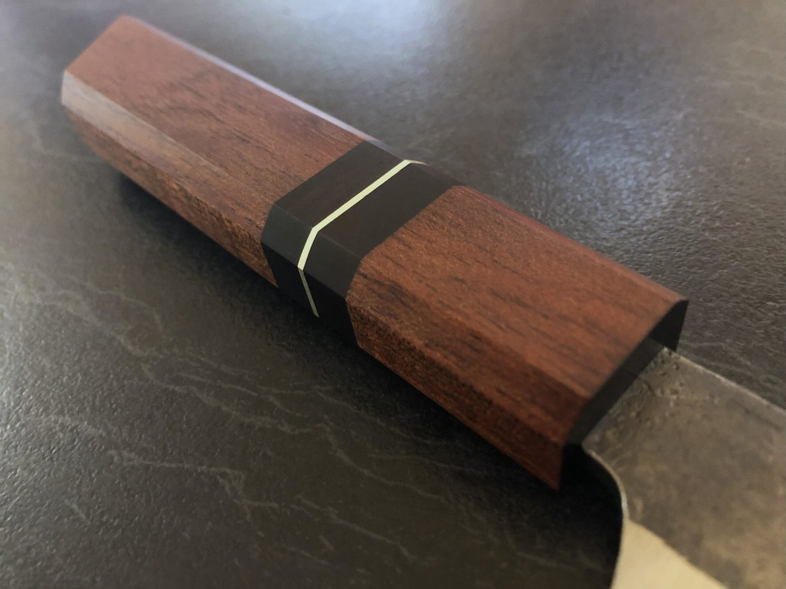 Construction: The blade is 3mm thick 1084 high carbon steel with a very slight distil taper. High carbon steels allow for a higher hardness and sharper edge than most of their stainless steel counterparts. This does result in less corrosion resistance but when cared for properly, this is not an issue. The edge length (in a straight line from the heel to tip) is 270mm (+/- 5mm). With a blade height of 37.5 mm (+/- 2.5 mm), it’s worth noting that it has limited knuckle room. The handle length is 125mm (+/- 2.5mm) and is octagonal, providing good grip but still remaining comfortable. The primary handle material is blackwood while the spacers are ebony and nickel silver. Finished with Danish oil.