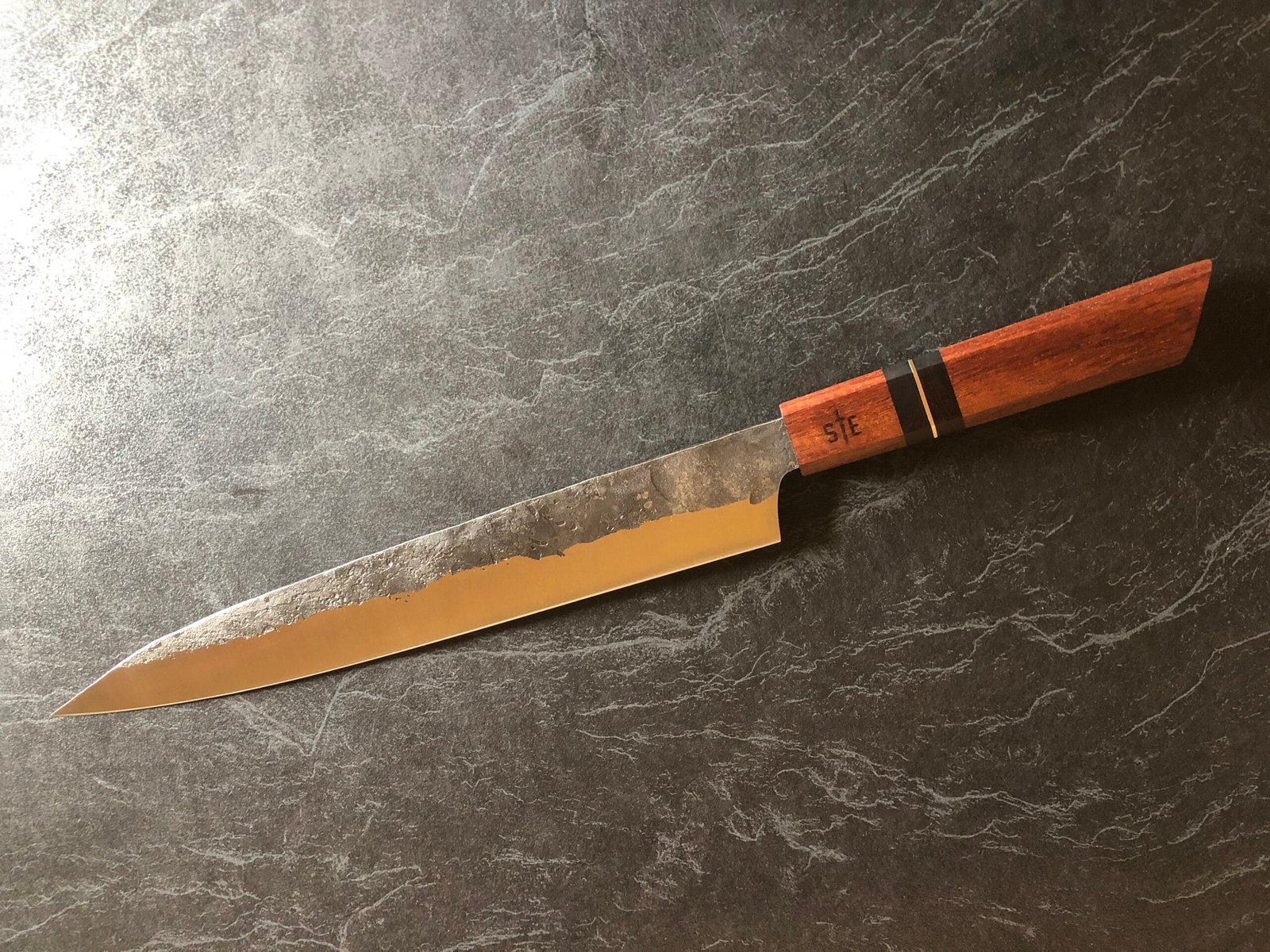 The Sujihiki (translating to “flesh slicer”) is a Japanese knife made for slicing meats. It is very similar to the Japanese Yanagiba but has a double bevel rather than single. The main feature of the Sujihiki is it’s length, making it easy to slice through large cuts of meat in very few draws.